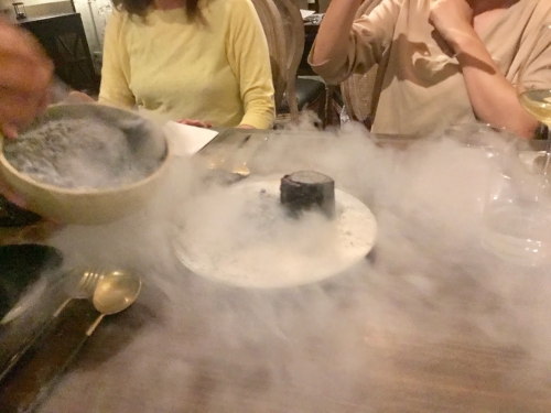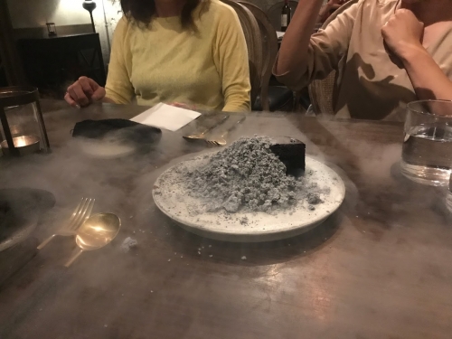 そしてその後は、チョコケーキをスタッフの方がワンカット。すると、そこから熱々のラズベリーソース&チョコと、中からも大量の煙が!