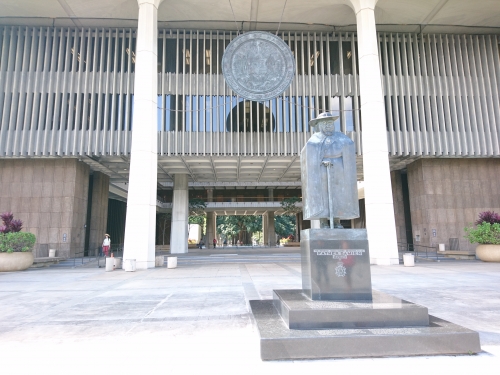 イオラニ宮殿の向かい側に建つ、現代的な建物が印象的な「ハワイ州政府ビル」。