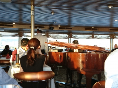 乗船時には、ウクレレの生演奏とフラダンスのショーがお出迎えしてくれ、ディナーの間はフロアの中央にあるピアノの生演奏を聴きながら、お食事を楽しめます。