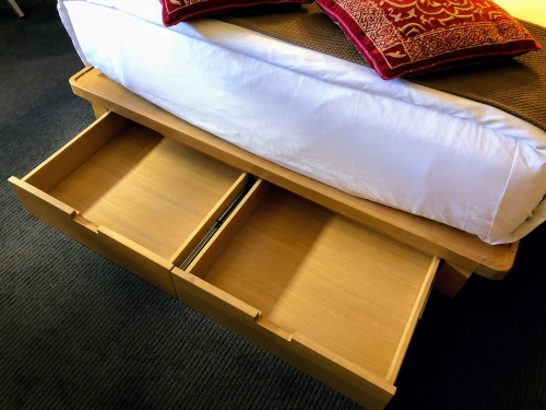 他にもバスルームのドアはサイドに開くようになっていたり、ベッドの下が引き出しとなっていたりと、狭いながらにも快適に過ごせるような工夫が随所に施されています。