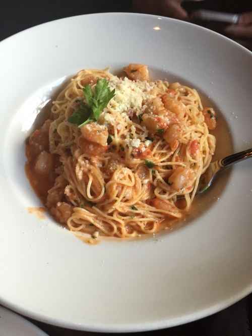 ぷりぷりの海老が沢山入ったビストロ・シュリンプ・パスタ($27,50)は、量もたっぷり。ガーリックやベーコンが入った他とは違うマッシュポテト($7,50)は、ポテト好きにおすすめ。一皿の量が多く無料のパンも付くので、オーダーのしすぎには注意しましょう。