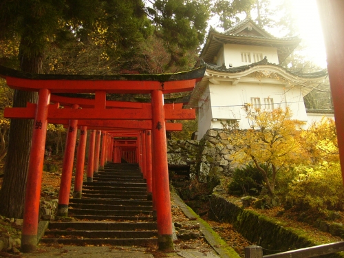 1604年に小出吉英によって築城され、明治の廃城令で取り壊しとなった城跡です。現在では復元された石垣や隅櫓を見学できる他、157段の石段を登った最上段からは出石の町並みを一望できます。城跡の隣には稲荷神社が鎮座しており、神社へ続く朱色の鳥居と白い城壁がとても美しいスポットです。