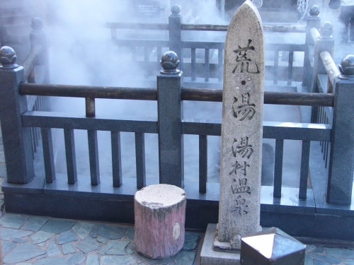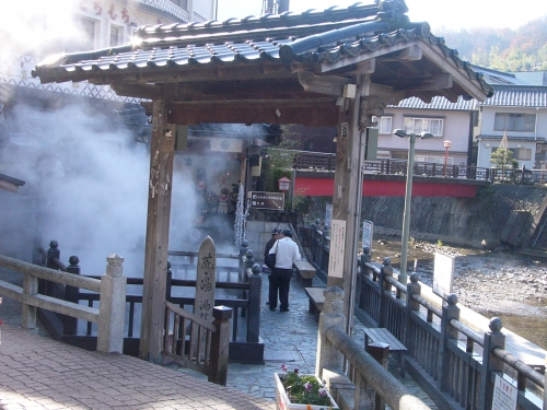 海岸沿いから内陸に入った山の中にある温泉郷です。毎分470リットルと湯量が豊富で、源泉が98度と日本屈指の高温温泉でもあります。