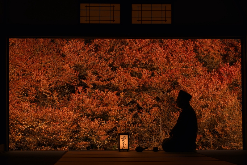 本堂の障子越しから眺める真っ赤なドウダンツツジは、まるで額縁にはいった一枚の絵画のようで、まさに絶景!例年11月中旬ごろに見頃を迎え、紅葉のライトアップも同時に行われます。(2021年はライトアップは行いません)