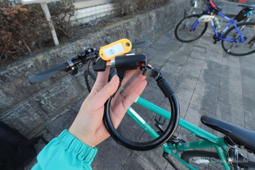 温泉に着いたら、正面玄関脇の駐輪場に自転車を停めます。このときレンタサイクルと一緒に渡された鍵を使います。盗難防止のため、前輪と車体をしっかりと固定しましょう。