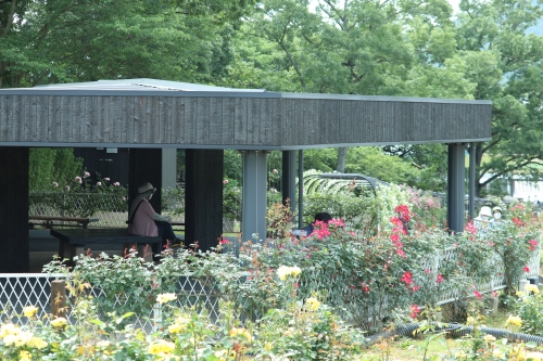 「バラテラス」エリアには低農薬で育ったバラが植えられ、サステイナブルなガーデンを演出しています。屋根付きの休憩所もあり、そこからパークを見渡せるようになっています。