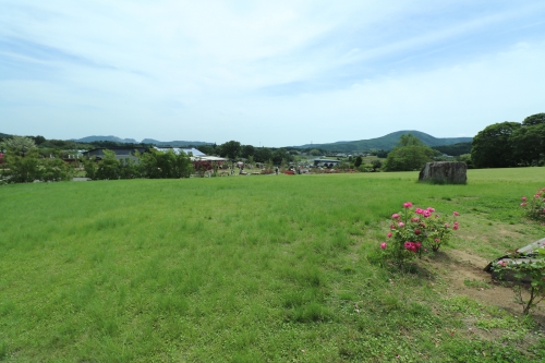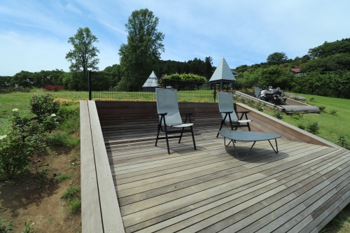 筑波山麓とバラを眺めながらウッドデッキでピクニックができるエリアです。ウッドデッキからの眺望が素晴らしく、里山の風景を存分に味わえます。園内は広いので、休憩するのに最適な場所です。