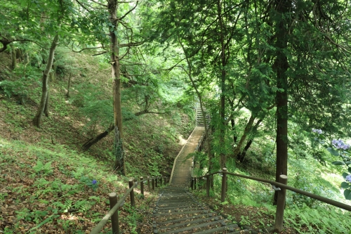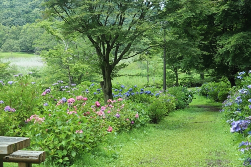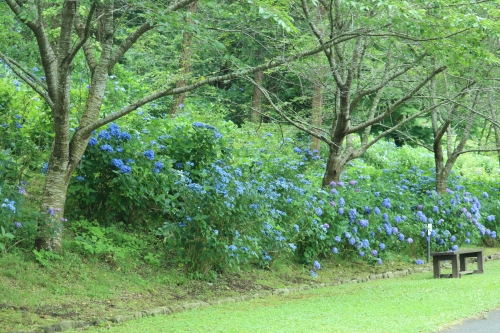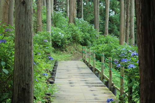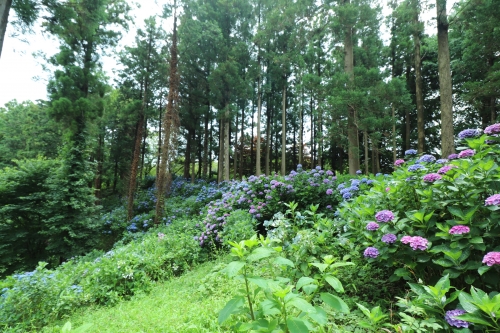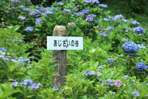 毎年6~7月に開催される「あじさいまつり」の会場です。山肌一面に約1万株のあじさいが咲き乱れます。谷を利用しているため日陰も多く、7月初旬に見頃を迎える印象です。