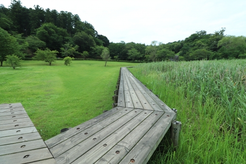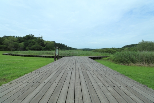 公園管理事務所を過ぎて園内に入ると、まずは木道が整備されています。ウッドデッキの上を歩くと爽やかな風を感じるでしょう。キャンプ場を利用される方は、この木道を通って向かいます。