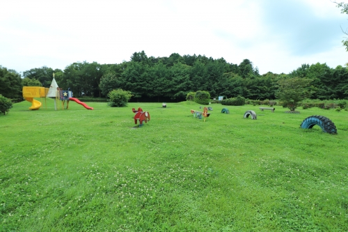 わいわい広場には、お子様向けの遊具が設置されています。広い芝生には、意図的に作られたミニサイズの丘もあり、飽きさせない工夫が嬉しいです。四つ葉のクローバーを見つけるのもいいですね。