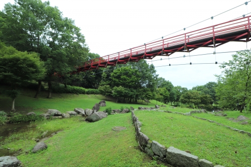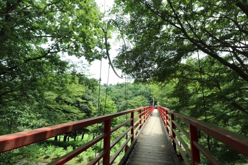 下の写真は、せせらぎ公園の真上架かる「イトトンボ橋」。1971年に涸沼で発見された、ヒヌマイトトンボに由来しています。真っ赤な吊り橋で、渡るとゆらゆらするスリリングな橋で、ここからせせらぎ公園を見渡すこともできます。