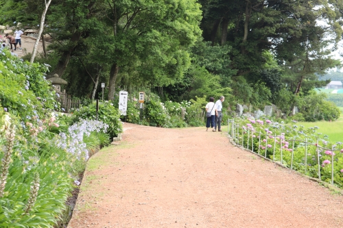 歩道は歩きやすく整備されています。また、紫陽花以外の花も見ることができます。