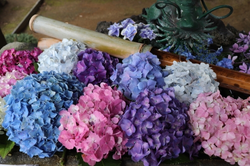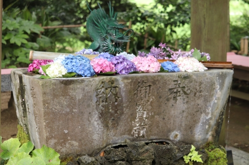 あじさいのシーズンは手水舎がお花でいっぱいになります。涼しげな様子に癒されますね。