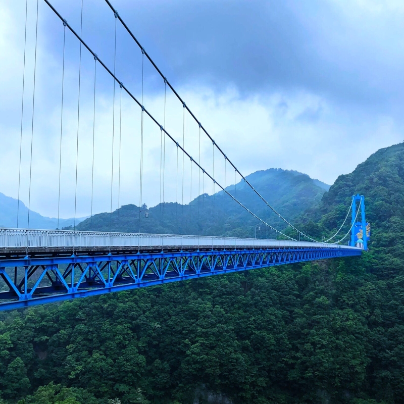 常陸太田市にある、竜神川を堰き止めた竜神ダムのダム湖の上に、約7年の歳月をかけて架けられた吊り橋。1994年に開通し、その全長は375mあります。
