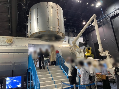 日本の人工衛星の開発モデルや、国際宇宙センター(ISS)の一部で日本が開発を担当した実験モジュール「きぼう」日本実験棟の実物大モデルなどが展示されています。