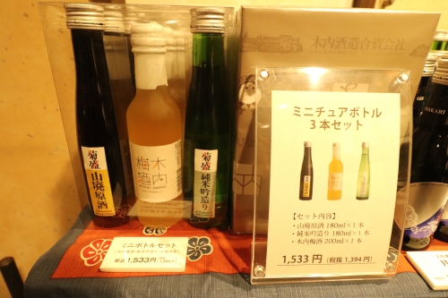 売店奥の突き当たりには、日本酒シリーズが揃っています。どれがいいか悩んだ時のために、「ミニチュアボトル3本セット(1,533円)」なども用意されています。