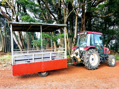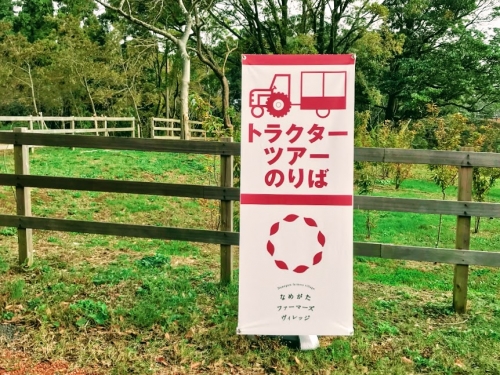 「らぽっぽ なめがたファーマーズヴィレッジ」のアクティビティの1つとして、トラクターツアーがあります。写真のトラクターツアー乗り場からトラクターに乗り、のんびりと農園をまわることができます。こんな体験、普段なかなかできないことなのでおすすめですよ♪