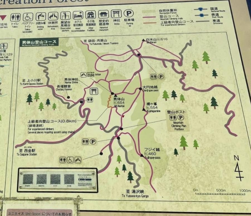 奥久慈男体山の上級者向登山コースは、健脚コース内に出てくる約0.8km区間のことで、この間は鎖場が連続します。(※写真のオレンジ線部分)