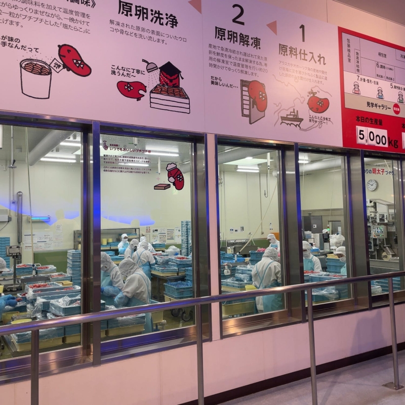 めんたいパーク大洗は明太子の老舗「かねふく」が運営する明太子のテーマパーク。工場内は無料で入場でき、明太子の製造過程をパネルで学んだり、実際の製造の様子もガラス越しに見学できます。