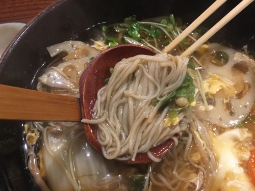 味噌煮込みうどんにはいくつか種類があり、味噌の色や季節ごとにお好みのものを注文できます。最も一般的なもの(1,150円)には白菜、椎茸、蓮根、サツマイモ、ホウレンソウ、カボチャなどたくさんのお野菜がのっています。