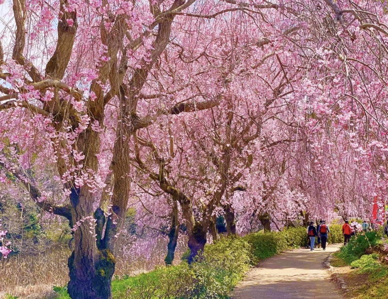 なかでも特に注目されているのが「枝垂れ桜のトンネル」!道の両脇に咲いた枝垂れ桜がトンネルをつくり、桜の花に囲まれた道を歩くことができます。