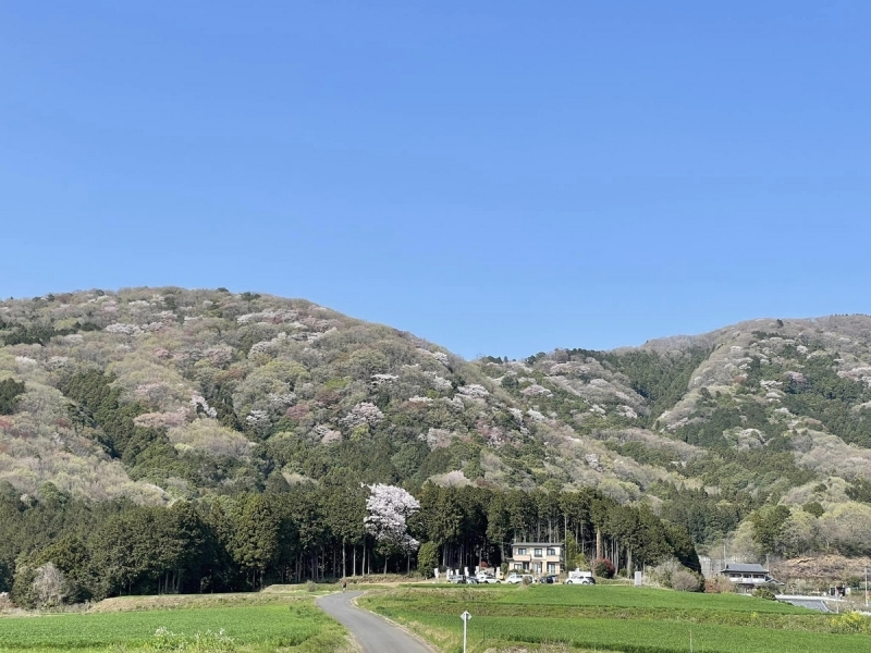 高峯は標高520mの里山で、数千本もの山桜が自生しています。見ごろを迎えると、桜の淡紅色と赤芽が木々のもえぎ色の芽吹きと重なり、まるでパッチワークのような絶景が楽しめます。