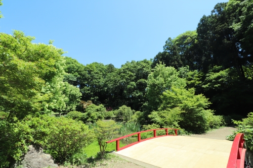 赤い橋が架かっているポイントがあり、和風の雰囲気を楽しめます。敷地内は高低差があり、ヒーリングエリアは低いところに位置しているため、階段を登って次のルートへ向かいます。