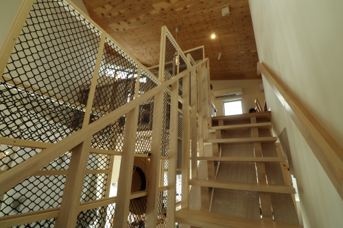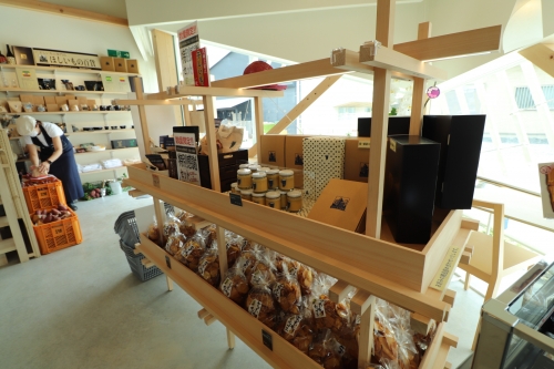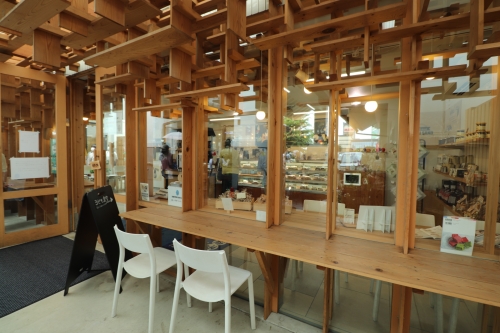 杉の木をふんだんに取り入れ、イモの繊維を表現したデザインの建築なのだとか。確かに外観をよく見ると、細長い木材が豊富に使われていますね。店内は、木のナチュラルカラーと白でまとまった配色です。でこぼこした立体的な空間となっています。