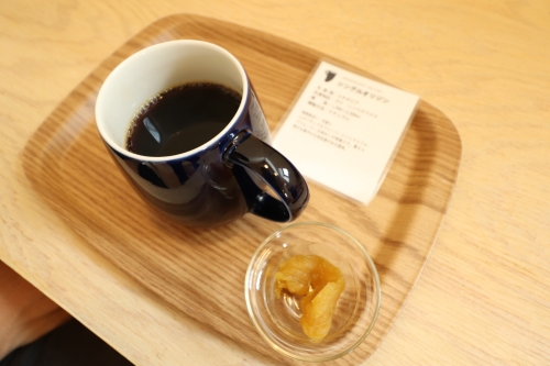 「HOSHIIMOミルク(650円)」は砂糖不使用とのことで、干し芋の優しい甘さとトロトロとした滑らかな飲み心地が魅力です。ハンドドリップコーヒー(550円~)もあります。各種ドリンクには一口サイズの干し芋が付いてきました。