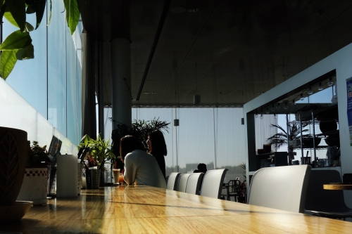 SEA BiRDS CAFEは、改札を出た場所から、望むことができます。まさに、宙に浮いた形のカフェは、空と水平線の間で浮いているようです。店舗は自由通路突き当りの右手。