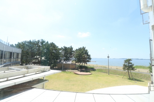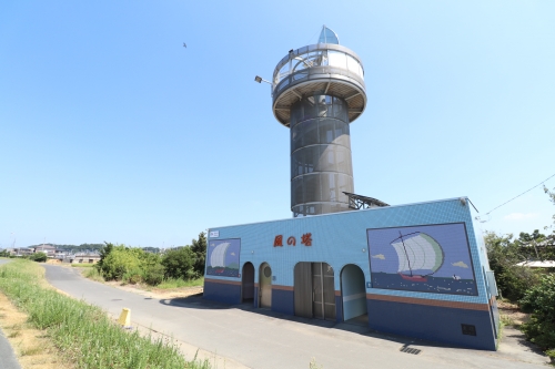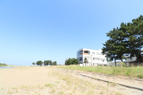 砂浜を振り返ると、温泉施設が見えます。2020年現在は登ることができませんが、螺旋階段が続く「風の塔」も近くに設置されています。