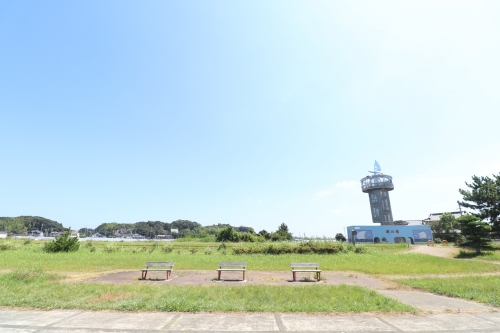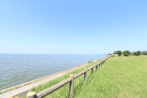 白い砂浜をさらに歩いて行くと、数分で「水郷筑波国定公園・天王崎園地」が広がります。芝生やコンクリートがあり、スポーツをするにはぴったりな場所です。