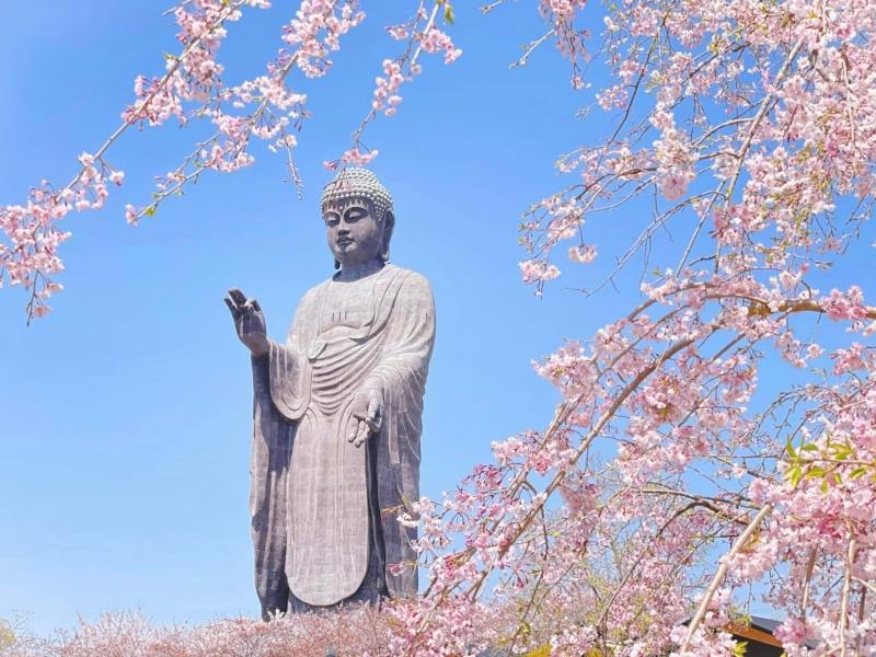 大仏様の足元には極楽浄土を表現した庭園が広がっていて、例年4月上旬~4月中旬には桜と芝桜の共演を楽しむことができます。