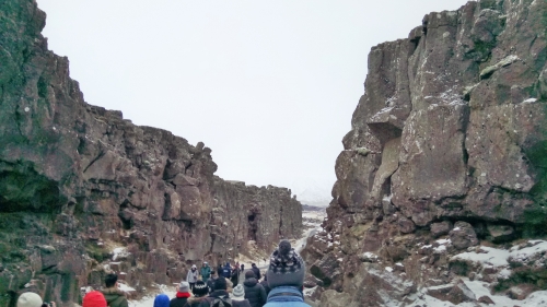 アイスランドには多くの国立公園がありますが、唯一ユネスコ世界遺産に登録されているのが、ここ、シンクヴェトリル国立公園です。「地球の割れ目」と呼ばれるギャウを地上で見られ、しかもその上を歩くことができる貴重なスポット。シンクヴェトリル国立公園にあるギャウはユーラシアプレートと、北アメリカプレートがが引っ張り合っている場所で、現在でも1年で2〜3cmずつ広がっていっているそうです。夏はこの割れ目の隙間をスキューバダイビングで潜って見ることができます。しかし夏でも水温は10℃以下で冷たいため、ドライスーツは必須です。