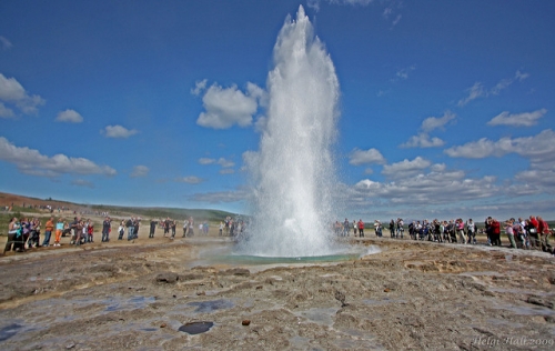 ストロックル間欠泉はほぼ5~10分起きに噴出し、地熱で沸かされた熱湯を20~30メートル上空の高さまで吹き上げます。30分ほど滞在していれば、少なくとも数回は確実に噴出を見られるでしょう。