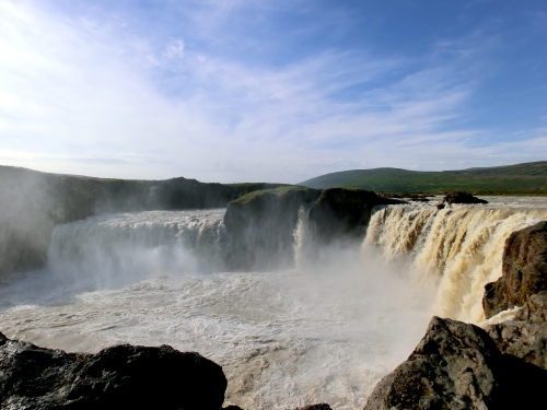ゴーザフォスは、中央の細い滝の左右に太い滝があり、馬蹄形になっています。氷河から流れ出た水はクリーミーなエメラルドグリーンで、神秘的な雰囲気が漂います。「Goða」は「神様」の意味で、その名の通りの神々しい滝です。この滝の周りは見渡す限り何もなく、あるのは大自然だけです。アイスランドの自然がいかに壮大なものか感じられる場所です。