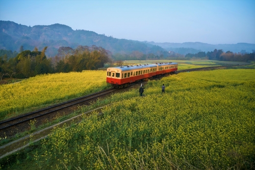 黄色い菜の花畑のなかを小湊鉄道の電車が走る