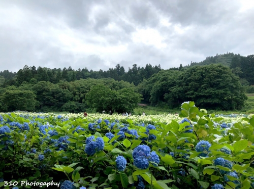 杉林の合間合間に紫陽花が咲き乱れており、その山の斜面は見渡す限り紫陽花だらけでかなり広大な範囲に至っています。