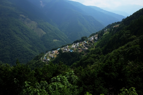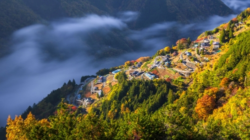 ヨーロッパのチロル地方に似ていることから「日本のチロル」とも呼ばれる「下栗の里」は、南アルプスを望む長野県飯田市にあります。標高1,000メートル、最大傾斜38度の傾斜にはりつくように、民家や農地が並ぶ不思議な景観地域です。駐車場から徒歩20分のビューポイントから見おろすと、まるでミニチュアのような下栗の里の全景が楽しめます。