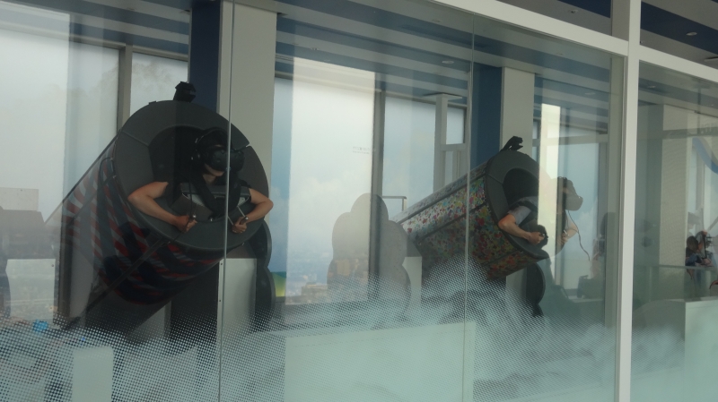 展望台最大の見どころはVRを使ったアトラクション。「TOKYO弾丸フライト」では、1回600円でスリル満点の飛行体験ツアーを楽しめます。VRゴーグルを装着して大砲に乗りましょう!