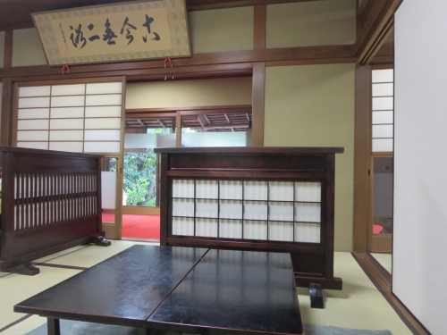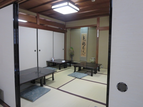 靴は靴箱に入れて上がります。団体での利用も多いのでしょうか、団体の靴箱は右側で個人の方は左側に靴を入れるようになっています。毛氈の上を歩いて席へ案内されますが、室礼に重厚な風格を感じます。