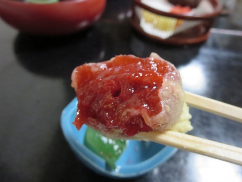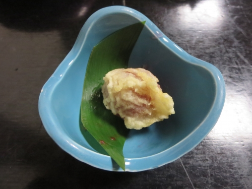 一番印象に残ったお料理が、こちらの梅の甘露煮の天ぷらです。甘く煮てある梅に、ごく薄く天ぷら衣をまとわせて揚げてあるのですが、口に含むとほろ温い梅がとろけて優しい甘さが広がり、感激します。