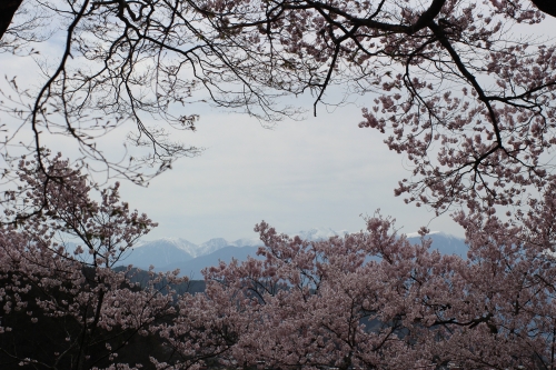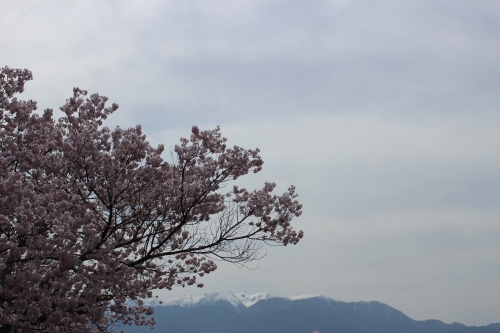 満開の桜の木々の間から見えるアルプスの山々には、まだまだ雪が残り寒さを感じさせます。春と冬の対比が非常に美しい眺めです。