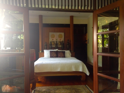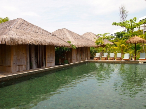 一方、こちらは15歳以下宿泊不可の大人のリゾート。特にこれといった建物もない田舎道を車で10分ほど行くと(送迎はホテルに頼みましょう)、ジャングルの中の癒しのスポットに到着。現れた施設は、静かに過ごして日頃のストレスを解消したいときにこそぴったりな佇まい。