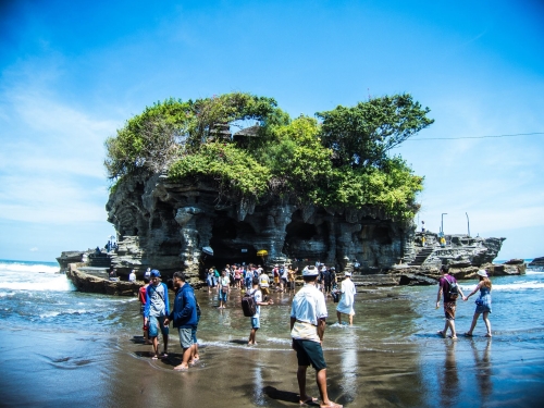 浅瀬の岩の上に建てられたその姿が特徴的な寺院。満潮時には辺り一面を海水が埋め尽くし、まさに「浮いている」ような景色が見られます。もちろん干潮時には写真のように渡って寺院のふもとまで行くことも可能です。また、サンセットスポットとしても有名で、時間を合わせて訪れると、寺院の後ろに沈んで行く幻想的な夕日を見ることできます。