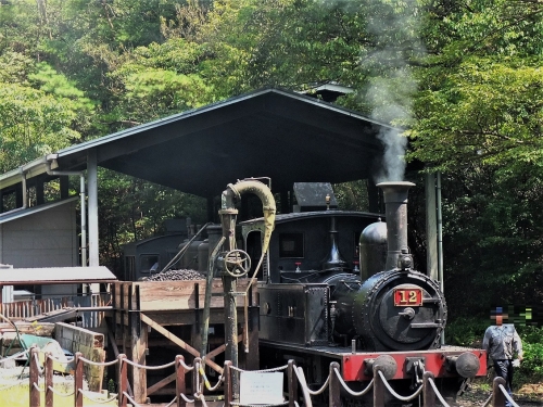 村内の乗り物は3種類あり、蒸気機関車(以下SL)に京都市電と村営バスとなっています。村内を走るSLのうちの1両SL12号は、明治時代に新橋=横浜間を走っていたもの。明治村内の東京駅(5丁目)=名古屋駅(4丁目)間を走ります。