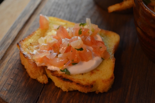 - ボクスティのトースト、ゴートチーズ、サルサ(Toasted Boxty Loaf topped with St. Tolas Goats Cheese and a Tomato and Red Onion Salsa)
