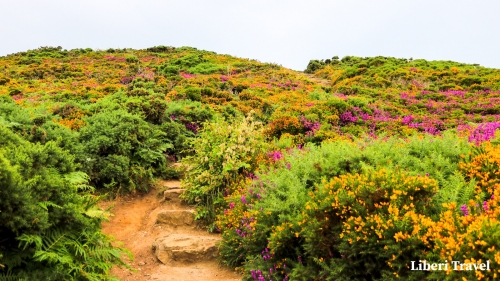 季節にもよりますが、筆者が訪れた7月下旬は、ピンクと黄色の花が咲いており、緑の草木と薄い青緑色の海、空の青とのカラーバランスが美しく、まさに絶景の連続でした。時々船が海を横切ったり、崖があったり、背の高い草の間の道を通ったり、飽きることはありません。