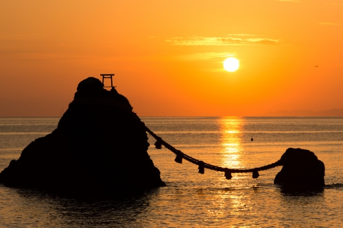 日本の神社の総本山として信仰される「伊勢神宮」が観光の中心。町にはいくつもの社があり、また門前に広がる「おはらい町」や「おかげ横丁」など、伊勢神宮を中心にさまざまな観光スポットがあります。伊勢市街から8kmほどの場所にある二見浦には、縁結びで有名な夫婦岩があり、こちらもあわせて立ち寄りたい。