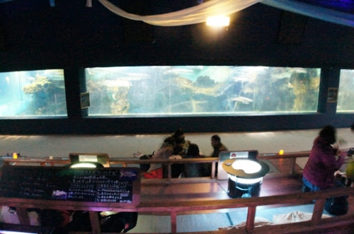 クッションにもたれたり、こたつにあたりながらくつろぐと、家のリビングにいるような気分になりリラックス。さらに、目の前には大きな水槽が設置され、悠々と泳ぐ魚たちを心ゆくまで眺めることのできる居心地のよい空間です。